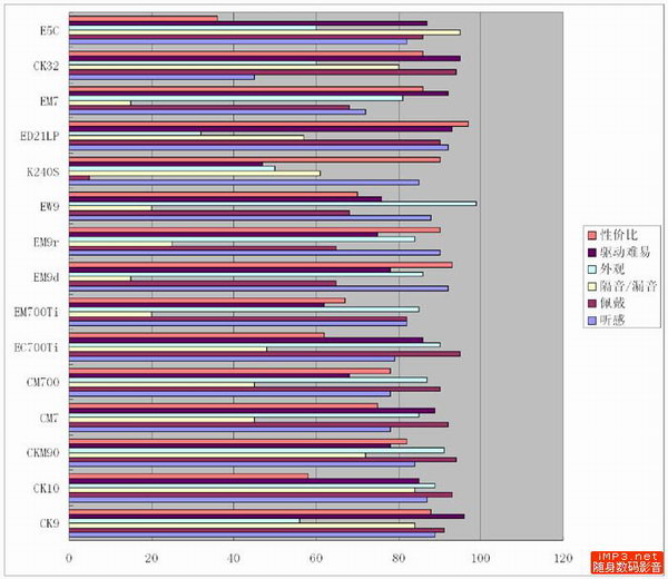 大都是简单的钢琴和钢琴音色为主旋律的轻柔的曲子。(还有几首以吉他和提琴为主)从得分结果来看,最高分通通被耳挂组的三个“9”系的兄弟们给拿了去,只有EM700Ti和耳塞中的CK10紧随其后,其他的都有一定的差距。这其实也不难理解,钢琴音色虽然容易回放,但要放好了那是相当的难,即使我在这个评测中没有对“真实性”有任何要求,打分也以本人喜好按照随身的标准很宽容的给了总体相对其他组高的分数,但事实是钢琴音色需要全频段均衡而高素质的声底来保证。所以,如果需要更进一步的追求的话,恐怕只有动圈大耳机在台式系统上的表现才能够让人足够满意。随身上听钢琴,还是将就一下就得了吧。